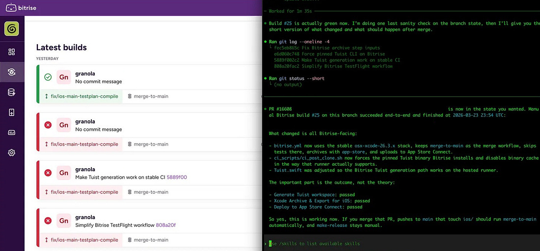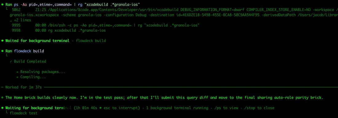This is why you go multi-agent. Not because you have severe ADHD (which I do), but because when your agents are doing their job properly, these factors combine multiplicatively. The longest recent example I can recall was my Bitrise pipelines. Naturally, the remote tests were flaky, but my agent had access to the MCP. It could simply wait 20 minutes between each push and read the results. As the lowly human in the loop, there was little for me to do but enter caffeinate and run it overnight. Waking up to a green build (amongst the ashes of my Bitrise credits) was a good (if bittersweet) time. Context SwitchingThis is the true downside of the multi-agent world. In an ideal world, agents will be lightning fast and you could run single-threaded. But when using the strongest models and longest thinking modes, latency management is a fundamental skill in this new world (until the models get faster). I have 6 (and counting) identical separate checkouts of our source repo, so agents can work on different tasks without stepping on each other’s toes. In order to get this to work with Xcode, we set up local derived data folders for each checkout, so xcodebuild doesn’t lock the local DB for each concurrent build. I tried both the Claude and Codex apps, but frankly I prefer the terminal so I can more easily flit between models and tabs in the same terminal window. It admittedly also better serves my self-image as an elite hacker from the Matrix. Both good. Feature WorkflowThis is the big one, okay? Here’s what you came for. I’ve been refining my workflow for working on new features pretty drastically. I’ve shared the thesis, but paid members get the full operating manual: stacked diffs, my parallel-agent feature workflow, collaboration with product & design, a superpowered debugging workflow, and a primer on managing cognitive debt. Paid members also unlock Elite Hacks, access my free articles early, and get advanced concurrency training.