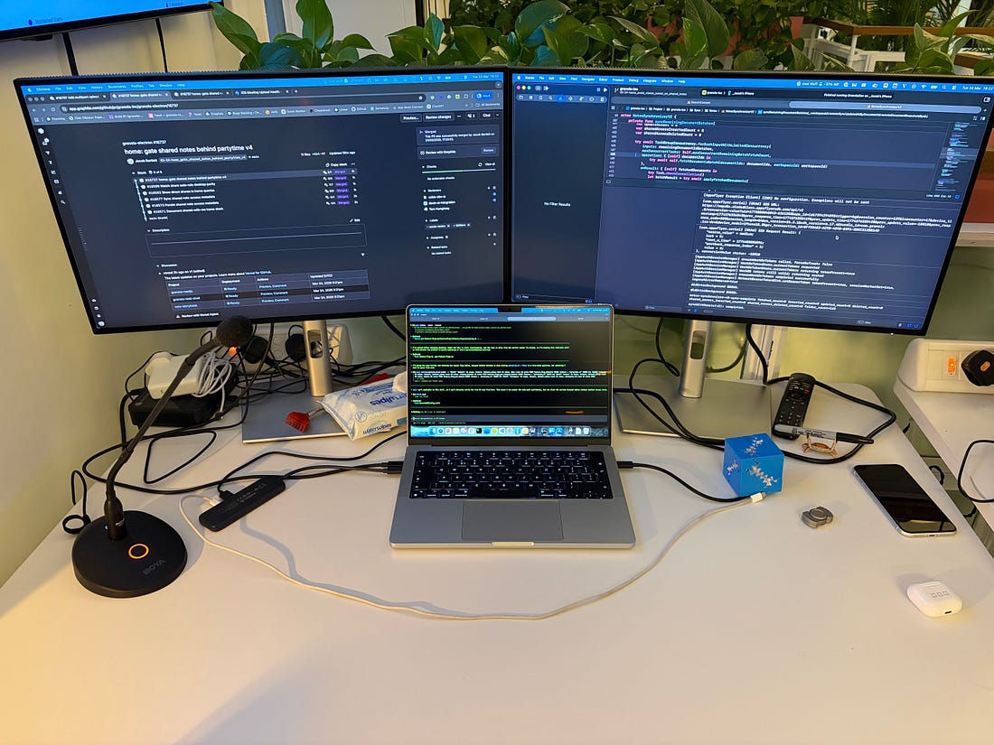 Rate my setup. If you’ve been following my escapades for a hot minute, you’ll know that after my brief stint of independence, I landed in Granola, a hot London startup building a popular AI notetaker. We just landed our Series C, officially making us a unicorn 🦄. Now, sit down. I’m about to rock your world: we use lots of AI. Our tiny mobile team punches well above our weight, shipping faster than I’d have dreamed possible back in November 2022 when ChatGPT launched (has it only been 3ish years?!). With my left hand, I wield a maxxed-out Claude Code subscription. With my right, a maxxed-out Codex subscription. The overwhelming majority of the code I ship (yes, easily ~99%) is written by an agent. This is, to use 2020 lingo, the new normal. I’ve been mucking around with agents since May last year, but rolling multiple agents in parallel most workdays has honed my workflow substantially. Seriously though, I’m getting so much done. It’s almost unbelievable. It’s absolutely not a strict measure of productivity, but I’m landing eight PRs a day on average. Nothing in this blog post is prescriptive: everyone has a workflow that works best for them. Some rip through Opus 4.7 credits in the terminal, some utilise the Cursor’s IDE for everything, some rock the Codex app. Many are gradually accelerating from single agent to multi (and beyond). Our guiding philosophy? Ship bricks. I hope you find it interesting. ContentsAgents running for hoursLet’s get this one out of the way first, because I myself have been inflicted by impostor syndrome from the tech bros that tweet about this constantly. I used to be incredulous about people who left agents running for a long time - or, worse - overnight, until I cracked it myself. And realised it’s nothing special at all: