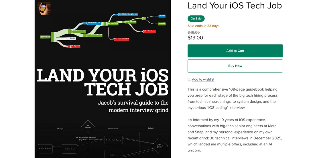 I’m here to help you with both of those things. Introducing…Land your iOS Tech Job This is a comprehensive 109-page guidebook helping you prep for each stage of the big tech hiring process: from technical screenings, to system design, and the mysterious “iOS coding” interview. It’s informed by my 10 years of iOS experience, conversations with senior engineers at Meta and Snap, and my personal experience from my own grind: 30 technical interviews across big tech and hot startups in December 2025.
